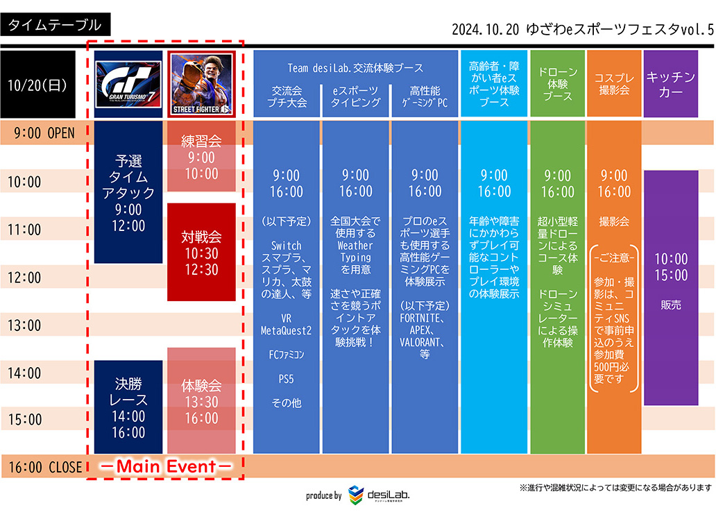 今年はメイン競技となる「グランツーリスモ7大会」「ストリートファイター6対戦会」をはじめ、eスポーツチーム Team desiLab.(チームデジラボ) や eスポーツコミュニティによるeスポーツ体験コーナー、最新ゲーミングPC体験展示、eスポーツタイピング、障がい者や高齢者向けeスポーツ体験のほか、ドローン体験やコスプレ撮影会、キッチンカーと、終日わくわくするイベントが目白押しです!